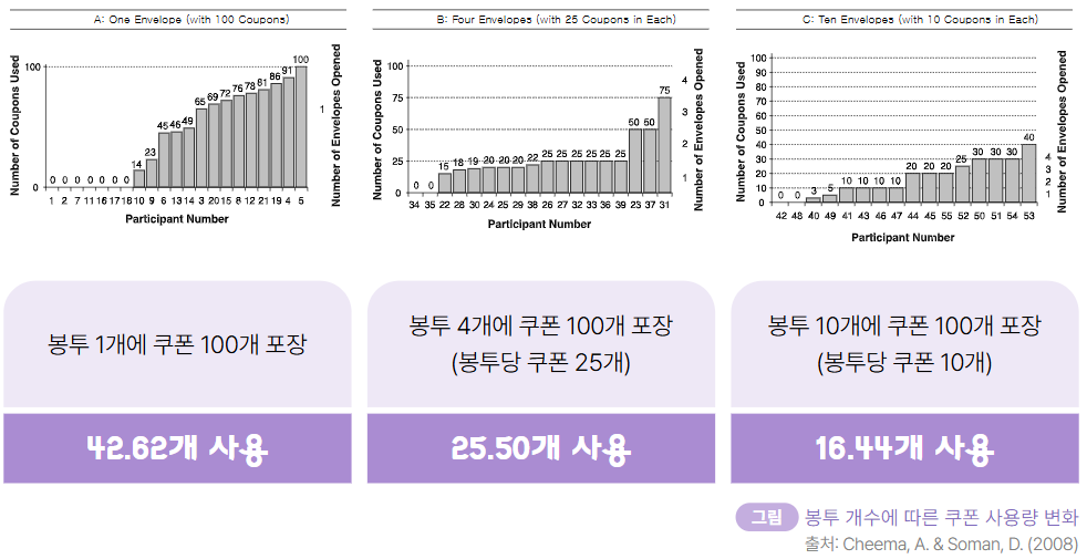 왜 이런 결과가 나왔을까요? 이는 사람들이 각각의 봉투를 별개의 계정으로 인식하고, 그 봉투를 깨는 것에 심리적 저항감을 느끼기 때문입니다. 사람들은 계정을 만들면 계정을 최대한 유지하고 싶어 합니다. 그런데 계정이 깨져버리면 “에라 모르겠다. 그냥 쓰자”라는 생각이 듭니다. 그래서 100개 쿠폰이 들어간 봉투 1개가 깨지면 한 번에 와르르 써버리지만, 쿠폰이 들어간 봉투가 여러 개 있을 때는 보통 한두 개의 봉투만 열어서 씁니다. 따라서 봉투의 개수가 많을수록 더 많은 심리적 장벽이 생긴다고 할 수 있습니다.